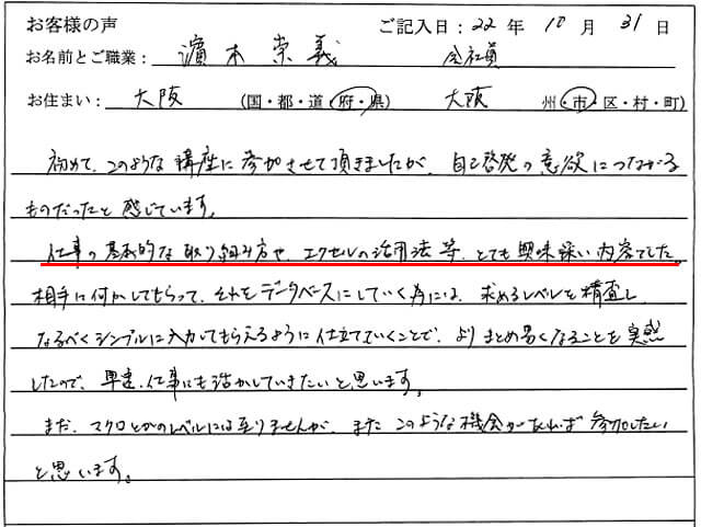 『エクセルというより、仕事そのものの効率化を教えていただき楽しかったです』